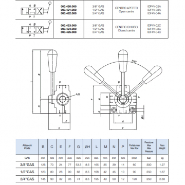 Когда рукоятка находится в положении 1 поток идет в порт В, одновременно с этим поток из порта А поступает в порт Т, когда в положении 2 –поток из порта Р поступает в порт А, а из порта В идет в порт Т. Дивертор типа С (с закрытым центром): в нейтральном положении все порты закрыты (возможны незначительные утечки), дивертор типа А (с открытым центром): в нейтральном положении соединены порты P c Т, А и В закрыты.