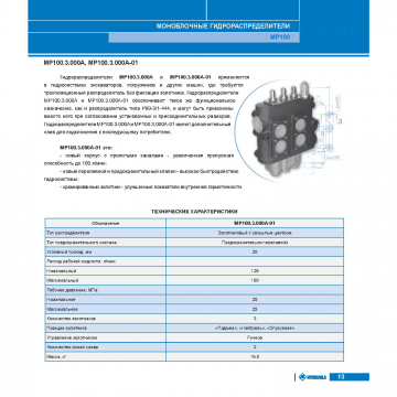 Гидрораспределители МР100.3.000А являются полными аналогами гидрораспределителей типа МР100(Р100)по функциональному назначению и габаритно-присоеденительным размерам и предназначены для распределения и регулирования давления в гидросистемах машин с насосами различной производительности от 20 до 160 л/мин.