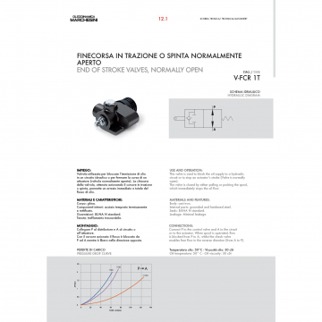 Нормально открытый клапан конца хода V-FCR 1T предназначен для отслеживания состояния максимального выдвижения гидроцилиндра. Кнопка, расположенная с торца клапана конца хода, при нажатии на нее штоком гидроцилиндра, обеспечивает переключение золотника клапана из открытого состояния в закрытое.