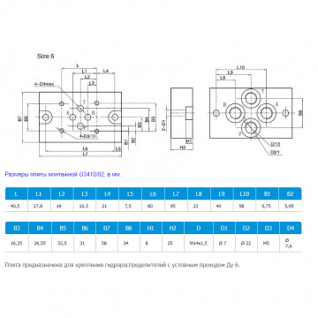 ПЛИТА ПРИСОЕДИНИТЕЛЬНАЯ (МОНТАЖНАЯ ДЛЯ ГИДРОРАСПРЕДЕЛИТЕЛЯ ВЕ6), ОТВОДЫ ВНИЗ, G3410/02 (УСЛОВНЫЙ ПРОХОД ДУ 6, РЕЗЬБА М14Х1,5)...
